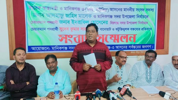 বৃহস্পতিবার দুপুরে মানিকগঞ্জ সদর উপজেলা আওয়ামী লীগ ও মানিকগঞ্জ-৩ আসনের সর্বস্তরের জনগণের ব্যানারে সদর উপজেলা পরিষদ চেয়ারম্যান প্রার্থী সুদেব কুমার সাহার বিরুদ্ধে মানিকগঞ্জ প্রেসক্লাব মিলনায়তনে এই সংবাদ সম্মেলন অনুষ্ঠিত হয়।